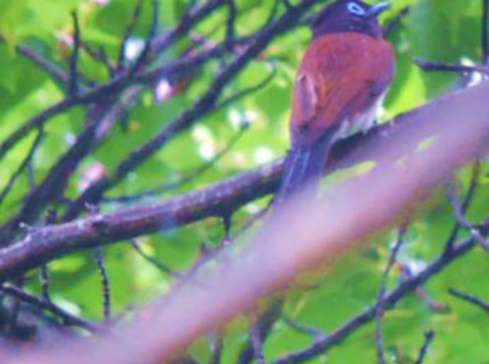 上の写真がホオジロ。木のてっぺんや電線などでも、よく鳴いています。スズメみたいに見えますが、鳴き声は全く違います。「一筆啓上仕り候」と聞こえるそうですが、私にはまったくそのようにはきこえません。下段の写真は、サンコウチョウ。目の周りがブルーのアイシャドウをしているようで、オスは尾羽がとても長く、50センチぐらいあります。鳴き声は、「ツキ(月)、ヒ(日)、ホシ(星)、ホイホイホイ」と鳴くので、三光鳥と呼ばれているようです。なんとなくそんな風に鳴いているようにきこえるかなー。この鳥は渡り鳥で、夏に日本に来て繁殖し、冬になる前に東南アジアに戻っていきます。戻るころには長い尾羽はなくなっています。