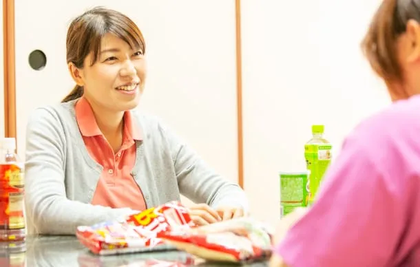 お弁当を食べ、スタッフとおしゃべりをしてゆっくりと過ごします。休憩室で仮眠をとることもあります。