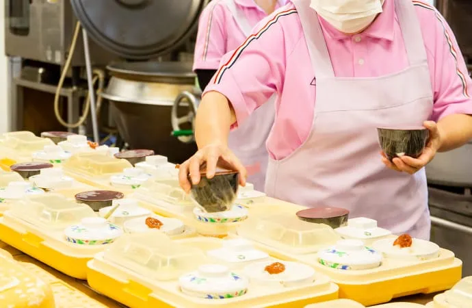 施設の夕食をお弁当にして、ご家庭にお届けする主に高齢者様向けのサービスです。栄養士がバランスの良いメニューを考え、美味しく食べやすい食事を作っています。